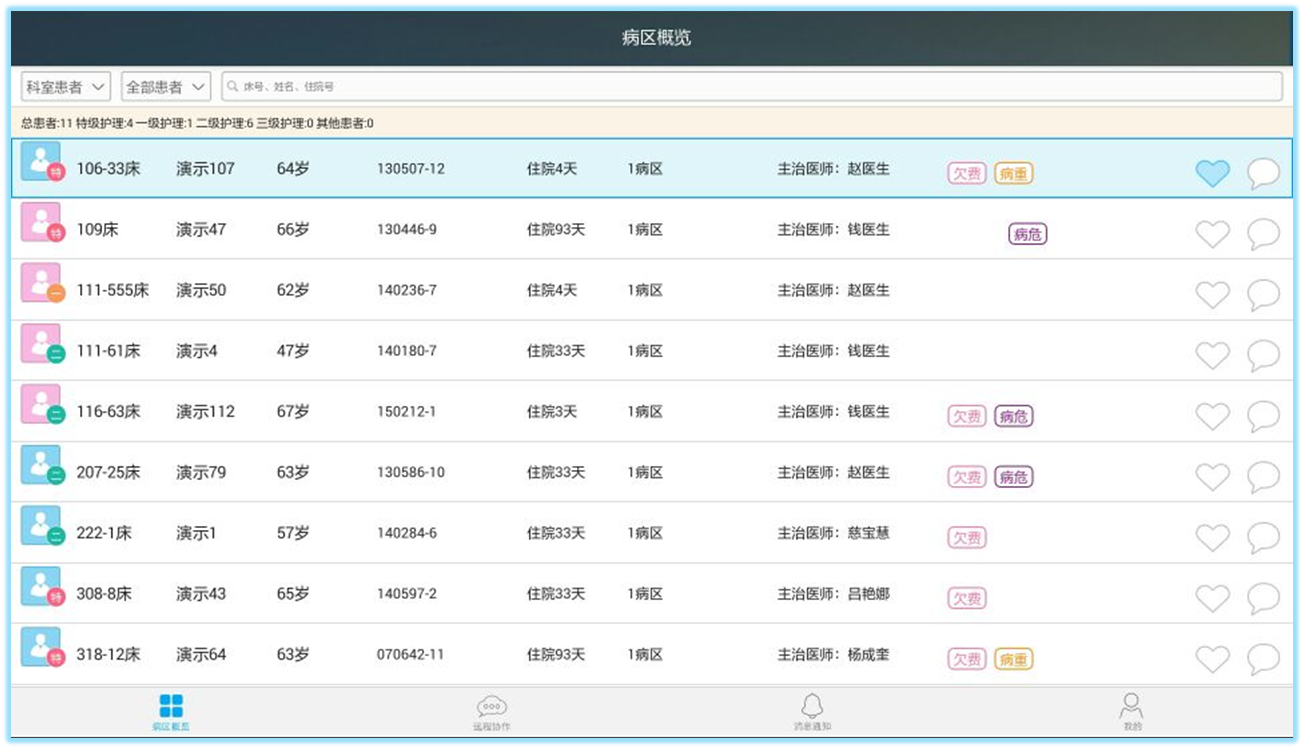 病情概覽——床位號、姓名、年齡、住院時間、病區(qū)、主管醫(yī)師